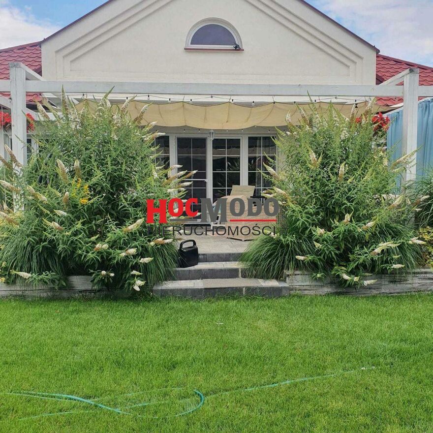 Jednocześnie, ogród został tak przemyślany aby nie angażował zbytnio. A więc rabaty wyłożono agrowłókniną i wysypano korę, gres aby minimalizować zachwaszczanie. Zainstalowano automatyczne podlewanie. Trawnik od rabat rozdzielają obrzeża betonowe , aby można było używać automatycznej kosiarki. Punktem centralnym ogrodu jest zadaszony taras z dodatkową pergolą. Taras jest obrośnięty kwitnącymi krzewami i obstawiony mnóstwem donic z kwiatami. Jest przedłużeniem salonu o część letnią. Umeblowany zestawem kanap i foteli ratanowych. W ogrodzie znajduje się również zakątek wellness and spa z sauną i jacuzzi z podgrzewaną wodą. Zażywając sauny można obserwować nocą gwiazdy przez prześwietlony sufit. Od frontu- ścieżki i podjazd do garażu wyłożony jest kostką. Parkan stalowo - betonowy. Brama otwierana automatycznie. Dom wyposażony w trzy alternatywne źródła ogrzewania. Centralne ogrzewanie zasilane piecem na gaz ziemny, sieciowy, kominek z rozprowadzeniem ciepła do pomieszczeń i klimatyzację z opcją grzania. Zbudowany z nowoczesnych materiałów jest ekonomiczny w utrzymaniu.