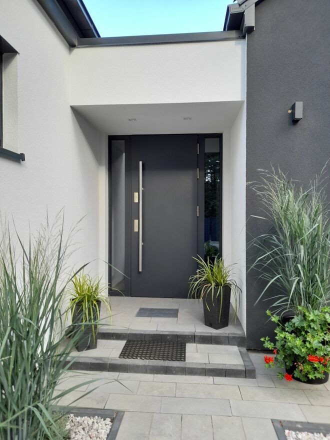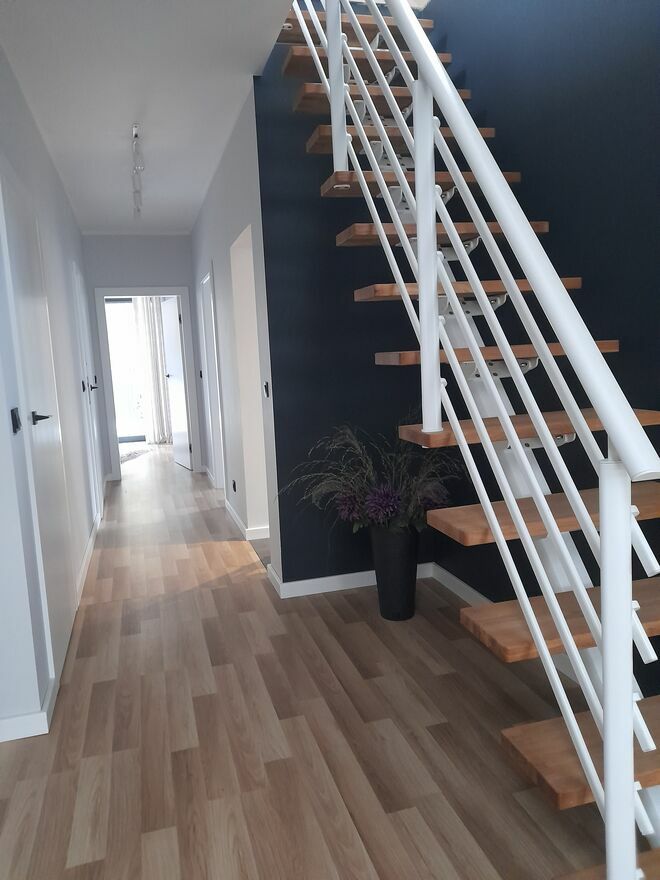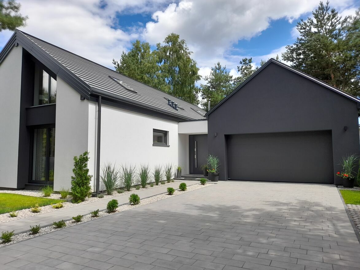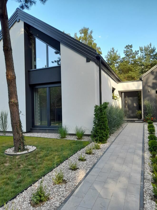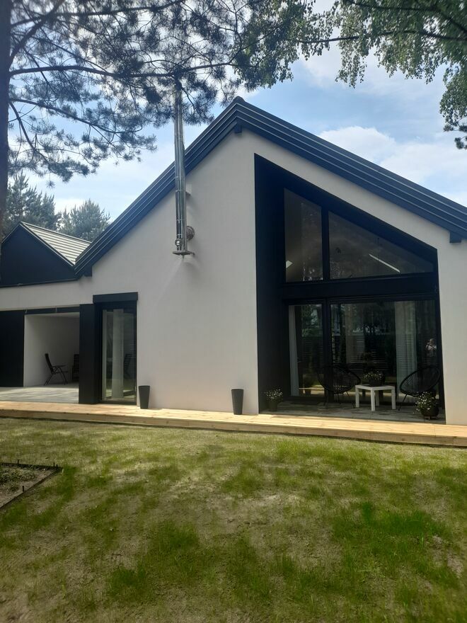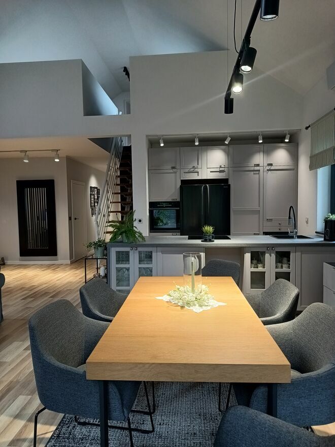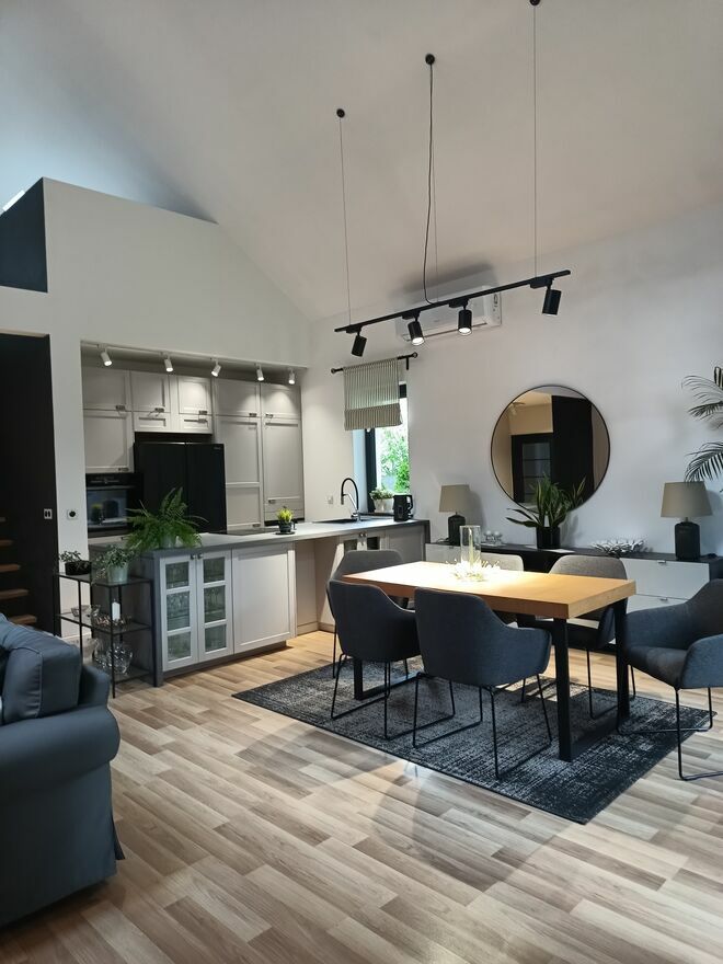 Dom wyróżnia się nowoczesnym stylem i funkcjonalnością. Posiada przestronny salon o wysokości 6 metrów i powierzchni 60 m2 wraz z aneksem kuchennym, w którym zaprojektowano duże okna doświetlające wnętrze.